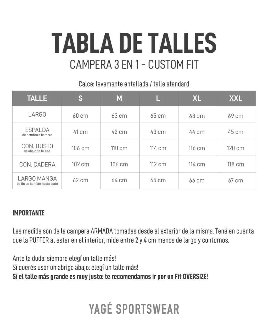 Aclaración: estas son las medidas del PILOTO, es decir de la campera armada. La puffer, al estar integrada adentro del piloto, mide algunos cm menos. En caso de que estés entre dos talles, te recomendamos ir por uno mayor.